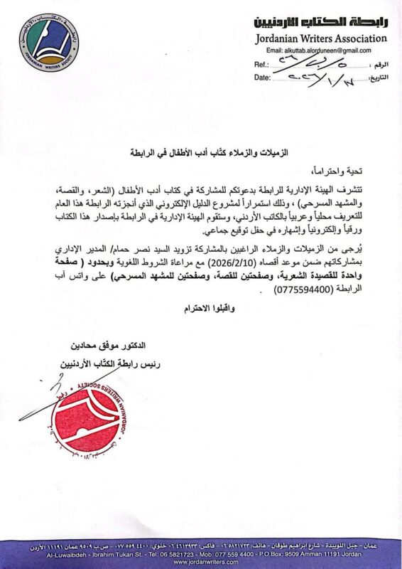 رئيس وأعضاء الهيئة الإدارية لرابطة الكتاب الأردنيين يتقدمون من الزميل الأستاذ مفلح العدوان (عضو الرابطة) بأجمل التهاني و...