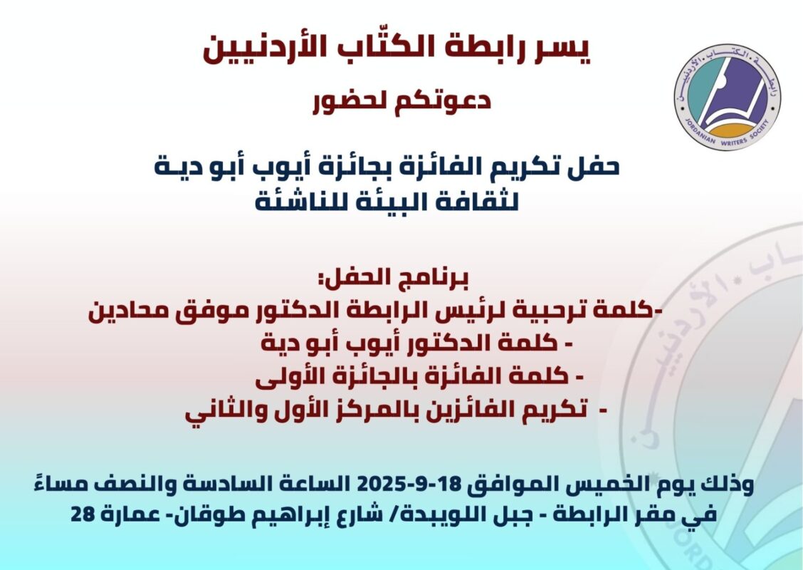 13 سبتمبر أخبار الرابطة حفل تكريم الفائزة بجائزة أيوب أبو دية لثقافة البيئة للناشئة. Posted by Naser Hamam 13 سبتمبر 2025 0 Continue reading