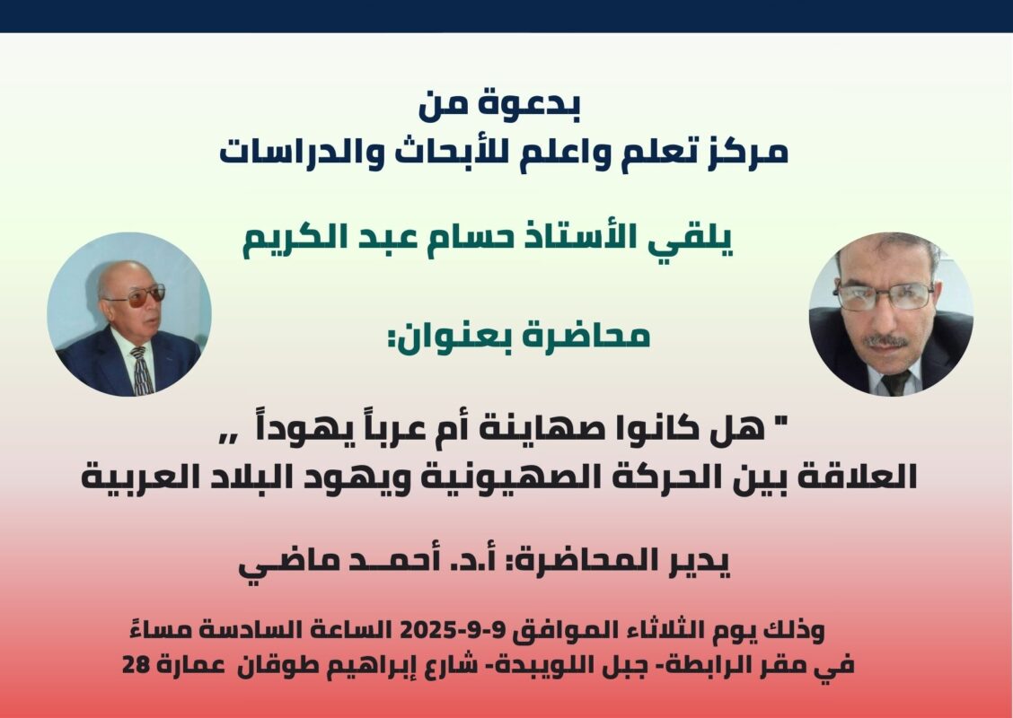 06 سبتمبر أخبار الرابطة ندوة بعنوان: هل كانوا صهاينة أم عرباً يهوداً ” العلاقة بين الحركة الصهيونية ويهود البلاد العربية” Posted by Naser Hamam 7 سبتمبر 2025 0 Continue reading